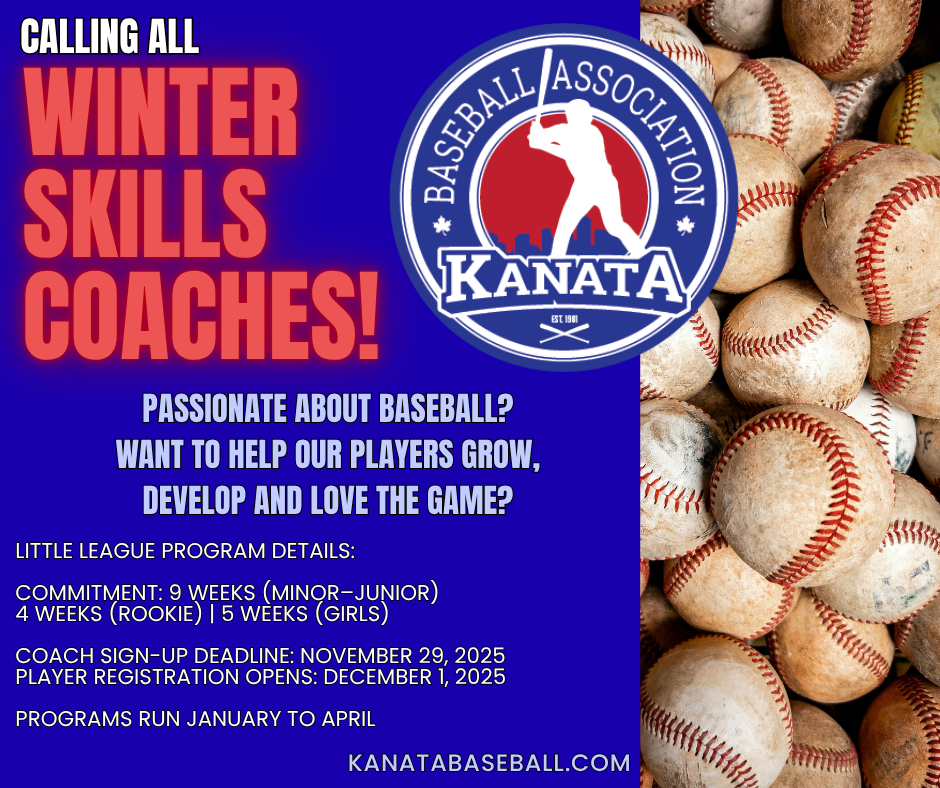 Kanata Baseball is excited to offer our Winter Skills Programs for the Minor (ages 9-10), Major (ages 11-12), and Junior (ages 13-14) divisions starting in January, and a Rookie (ages 7-8) and Girls-Only Program (ages 7-16) beginning in March!